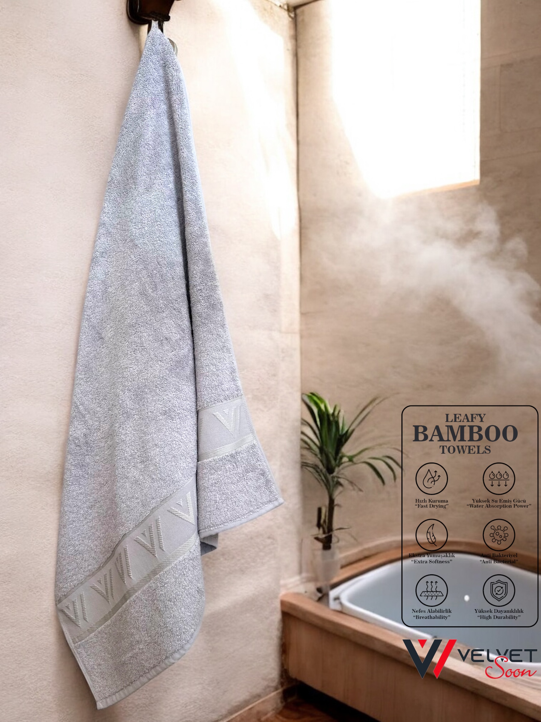 Doğal bambu liflerinden üretilen, antibakteriyel ve hipoalerjenik bambu havlu ile cildinize nazik dokunuş! Yumuşak, hızlı kuruyan ve çevre dostu özellikleriyle her kullanımda rahatlık ve hijyen sunar. renk Gri , ölçü 70×140 cm
