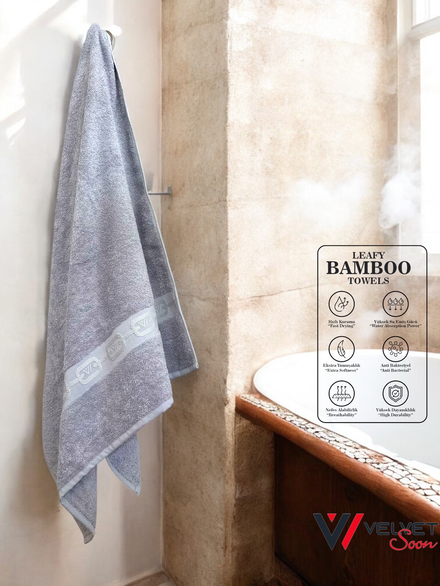 Doğal bambu liflerinden üretilen, antibakteriyel ve hipoalerjenik bambu havlu ile cildinize nazik dokunuş! Yumuşak, hızlı kuruyan ve çevre dostu özellikleriyle her kullanımda rahatlık ve hijyen sunar. renk Gri , ölçü 70×140 cm