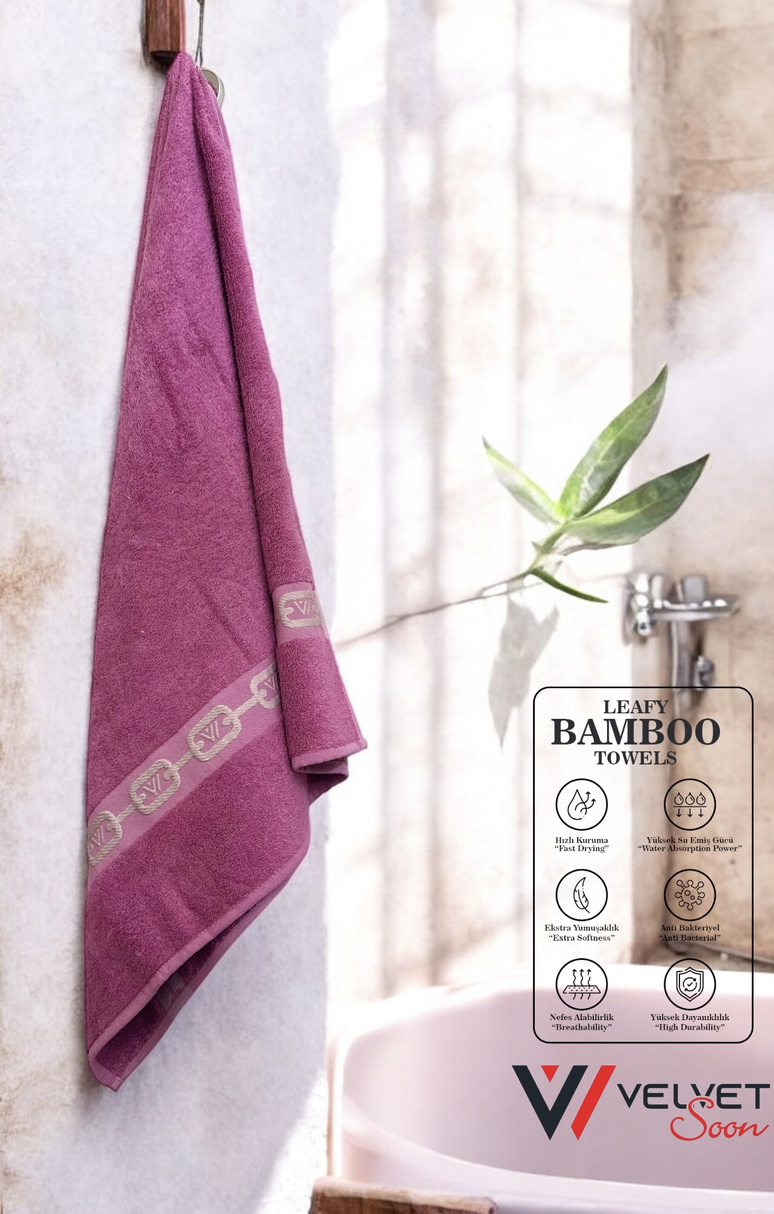 Doğal bambu liflerinden üretilen, antibakteriyel ve hipoalerjenik bambu havlu ile cildinize nazik dokunuş! Yumuşak, hızlı kuruyan ve çevre dostu özellikleriyle her kullanımda rahatlık ve hijyen sunar. renk Mürdüm, ölçü 70×140 cm